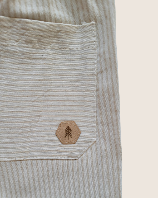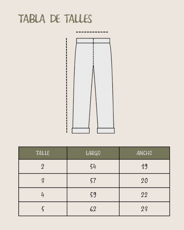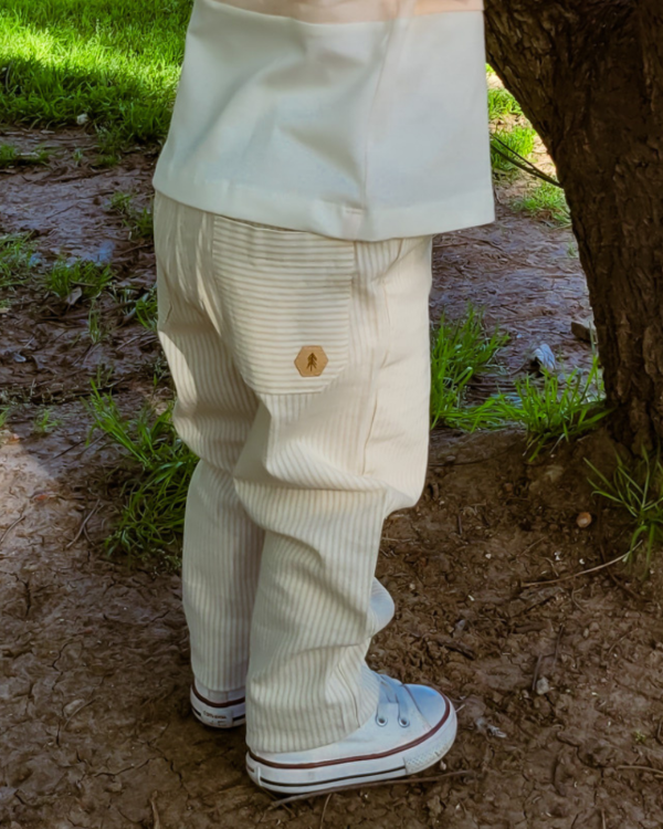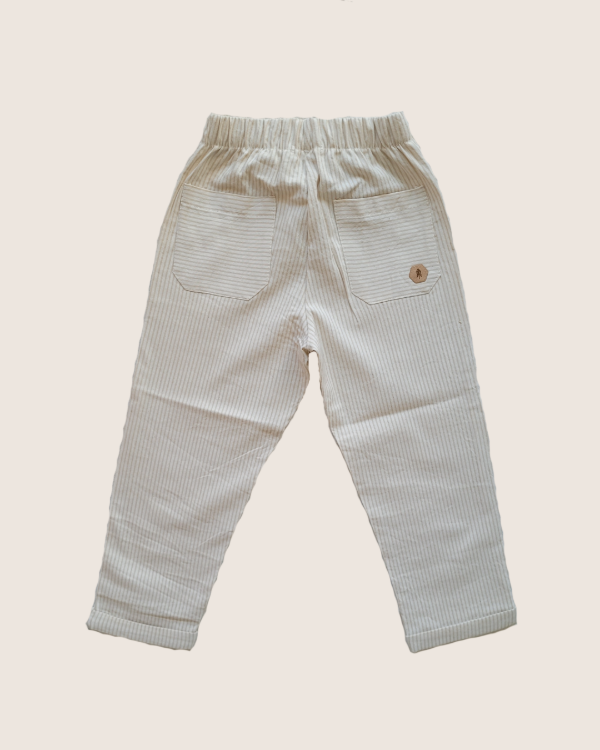 Pantalón confeccionado en tusor rayado. Bolsillos traseros con rayas invertidas, cordón de hilera, botamanga y aplique de la marca en el bolsillo derecho trasero. Encontrás la tabla de talles en la última foto.