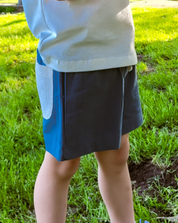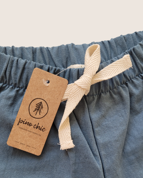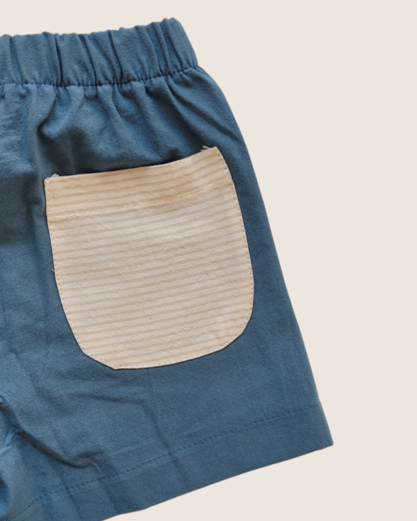 Short confeccionado en tusor liso con bolsillo derecho trasero de tusor mil rayas arena, cordón de hilera y aplique de la marca.