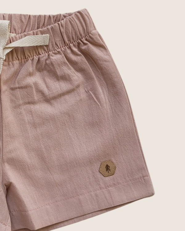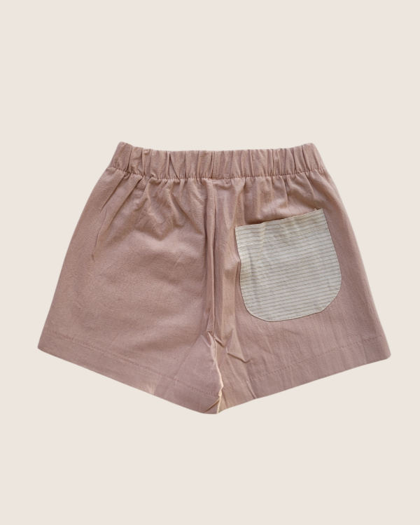 Short confeccionado en tusor liso con bolsillo derecho trasero de tusor mil rayas arena, cordón de hilera y aplique de la marca.